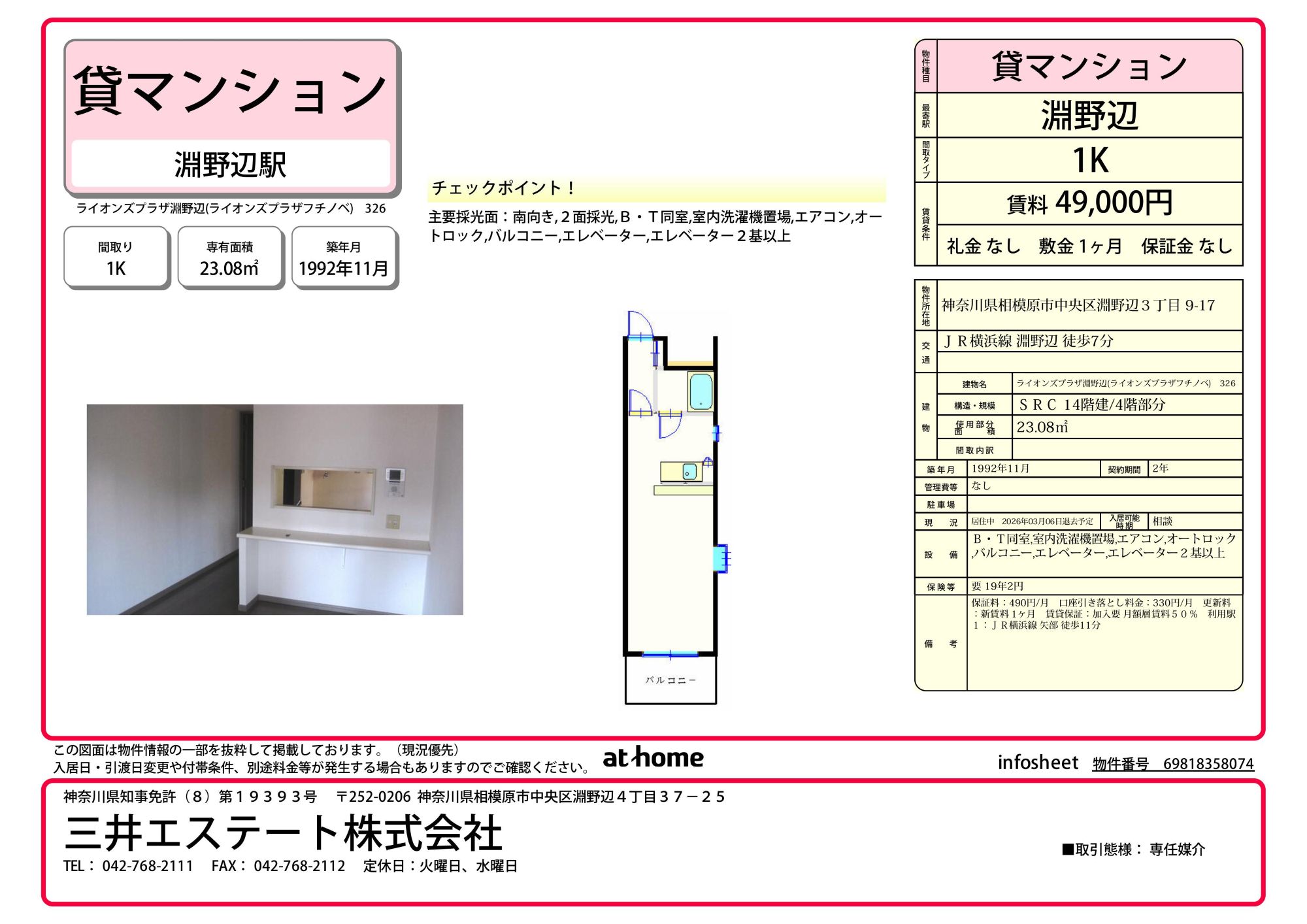 | 建物名 | ライオンズプラザ淵野辺326号室 |